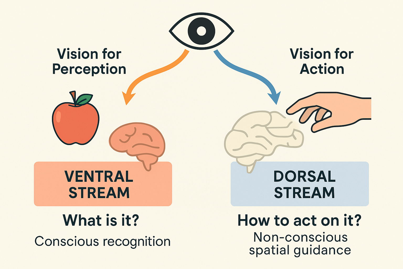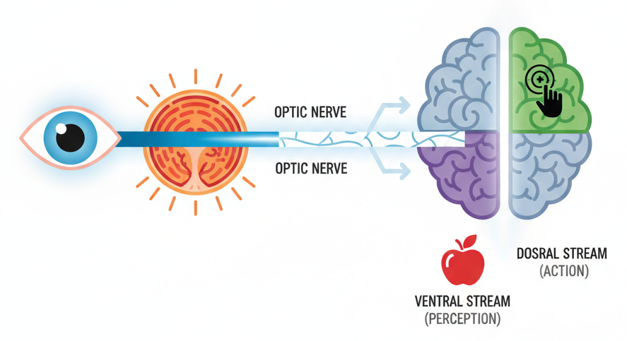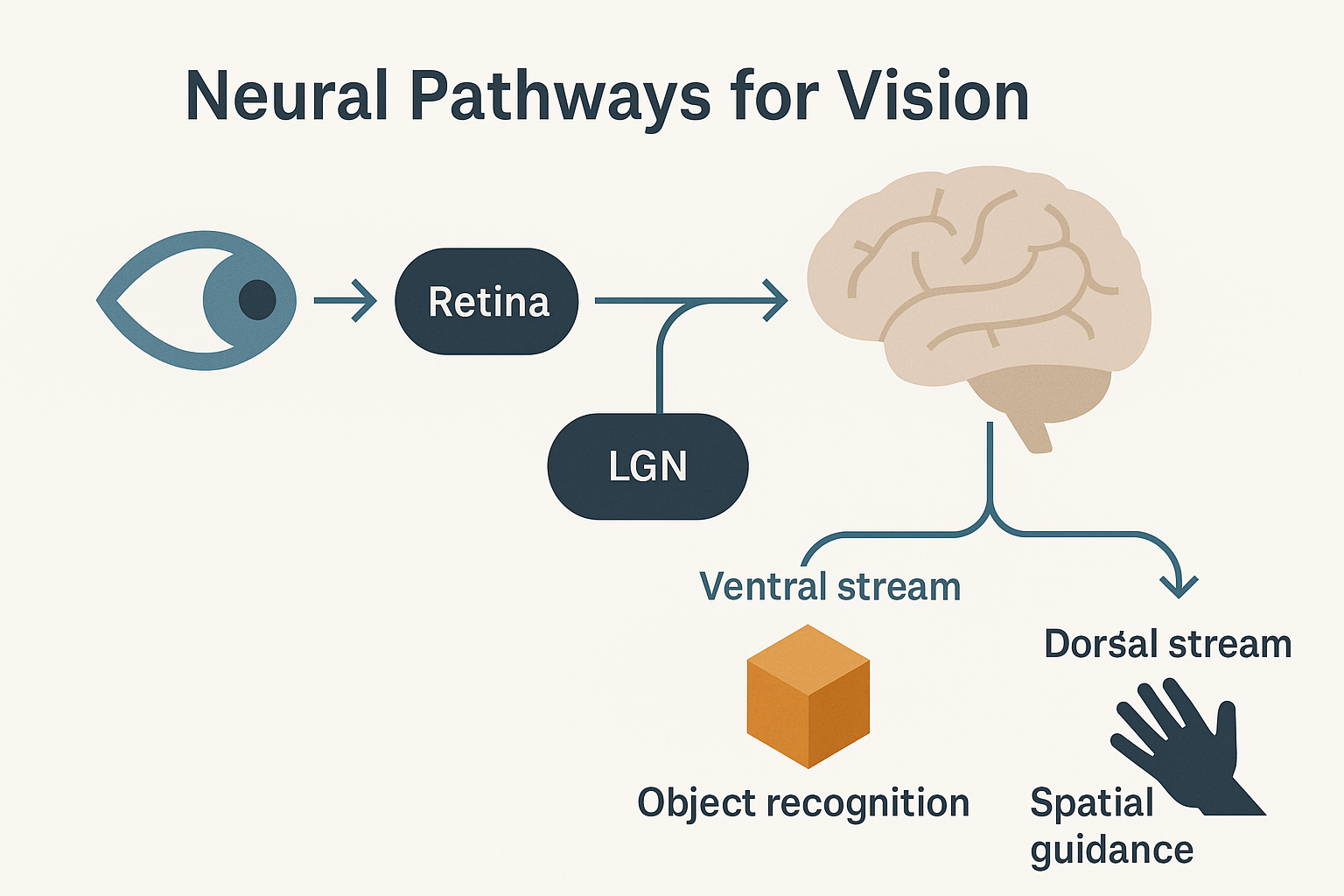 🧠 Pathways: Retina → LGN → V1 → ventral (perception) and dorsal (action) streams running in parallel