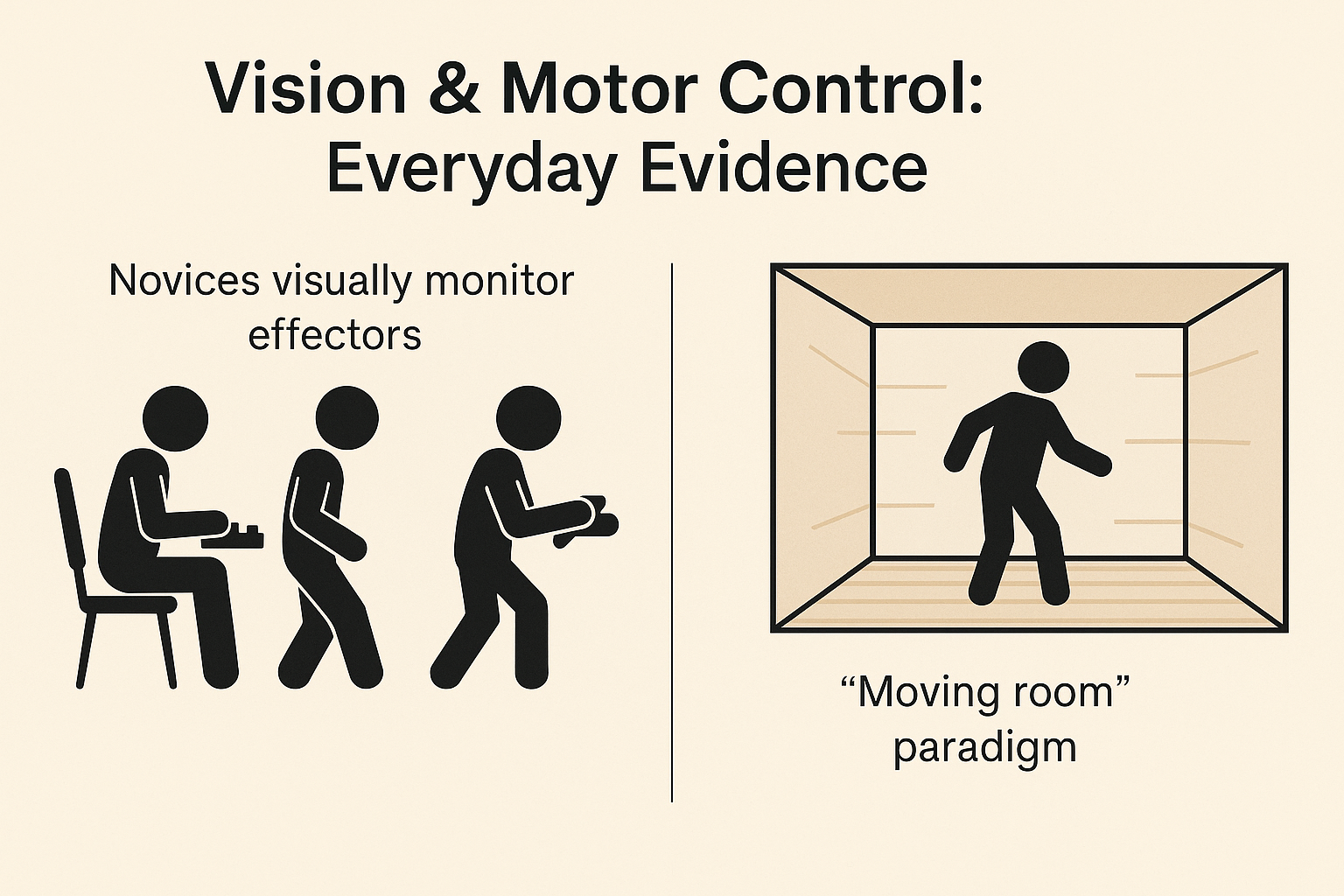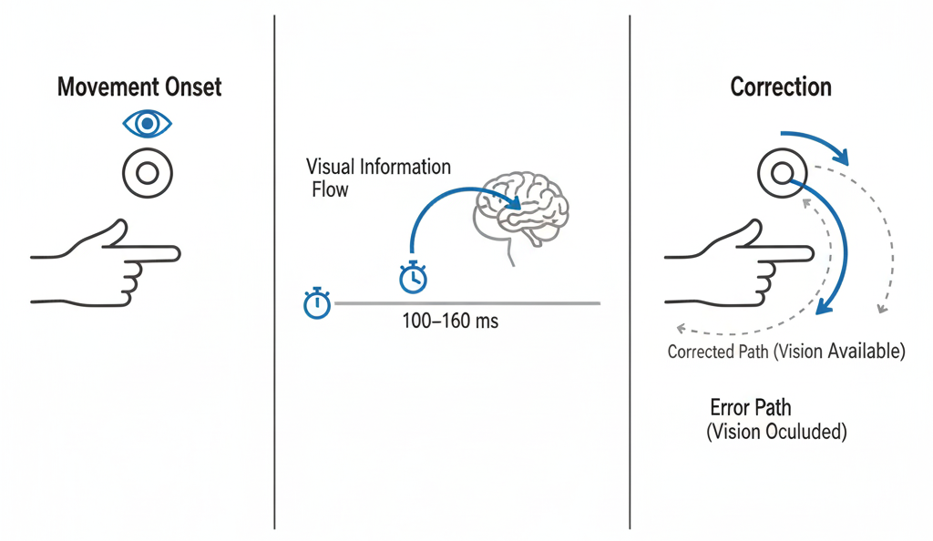 ⏱️ Online corrections: vision-driven adjustments emerge in ~100–160 ms—fast moves rely more on feedforward