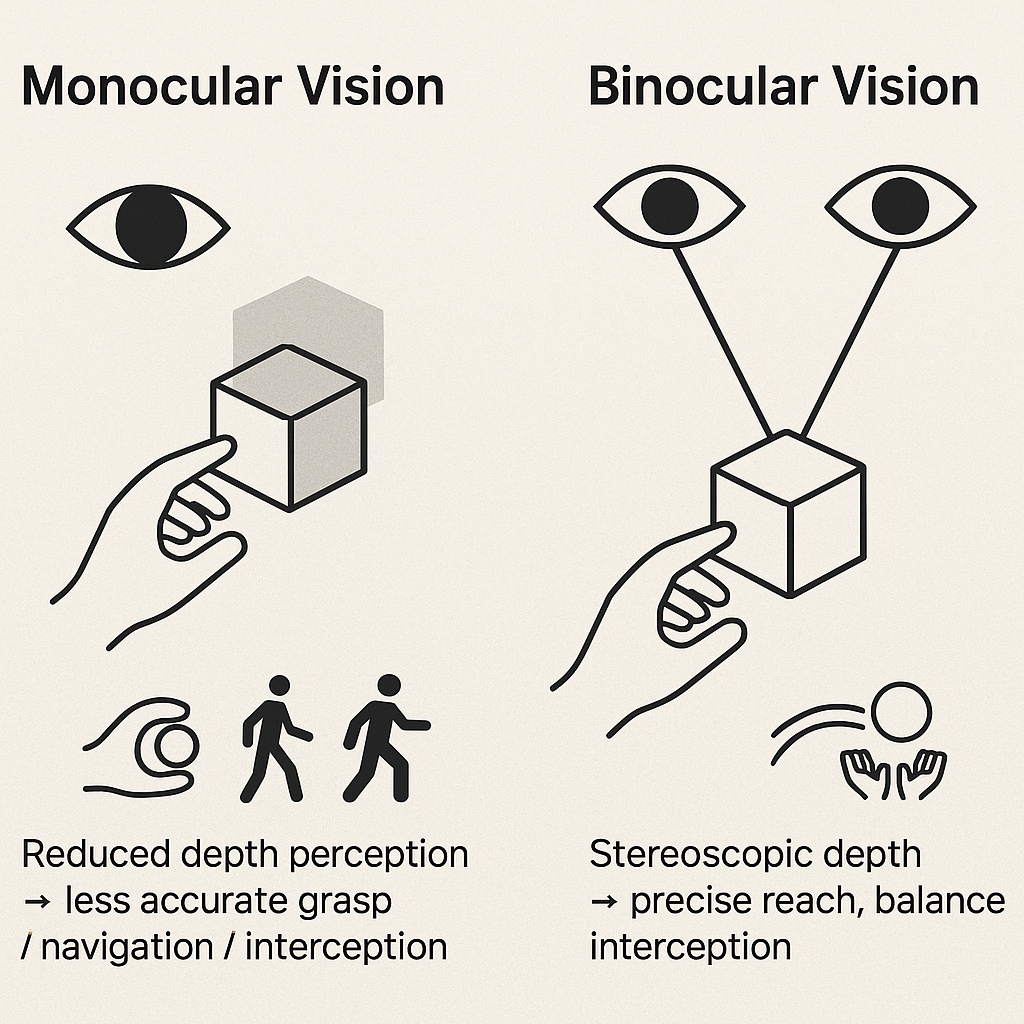 🔭 Monocular vs. binocular: binocular depth boosts 3D tasks (reach–grasp, navigation, interception)