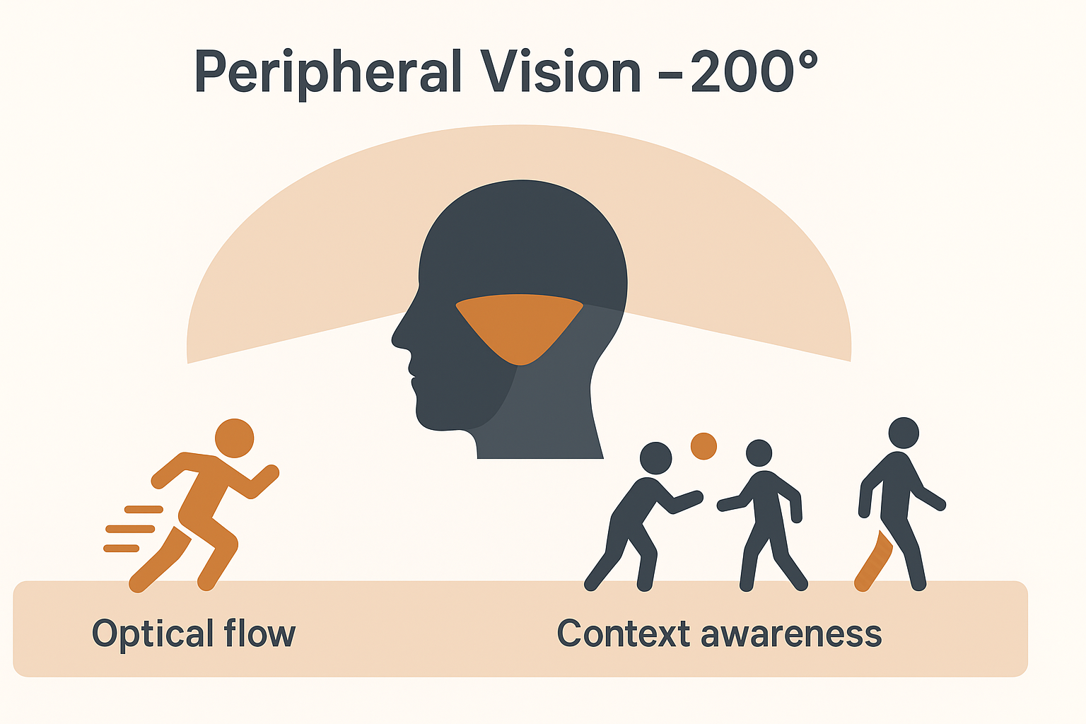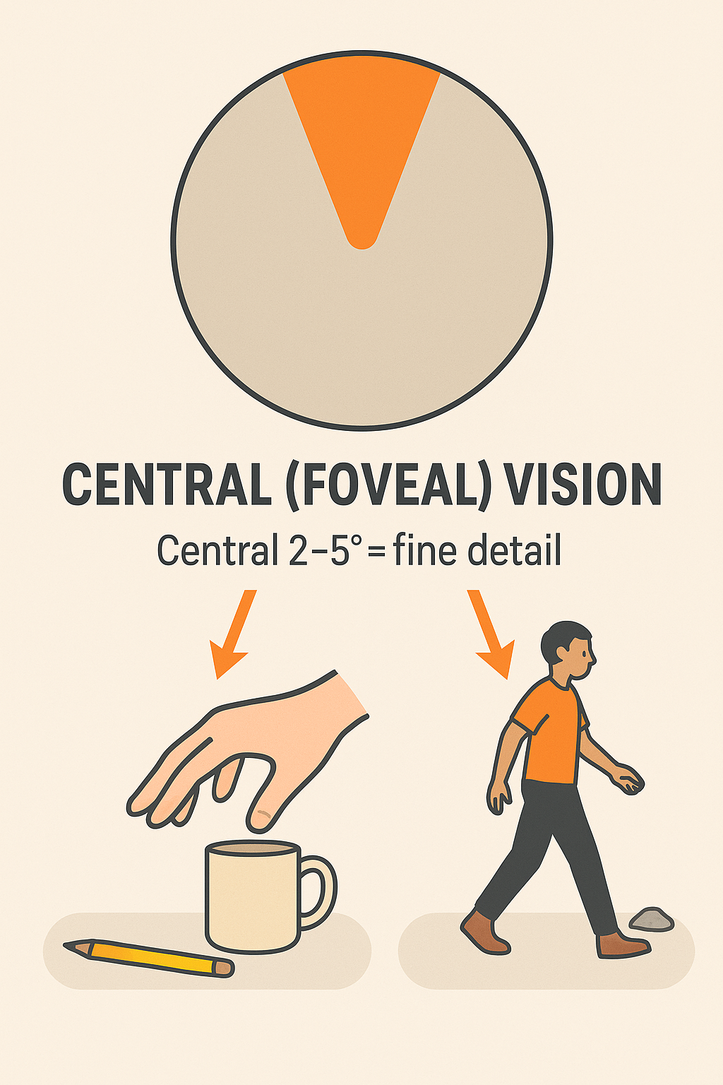 🎯 Central vs. peripheral: central = fine detail/regulatory conditions; peripheral = context, limb motion, optical flow for posture/locomotion