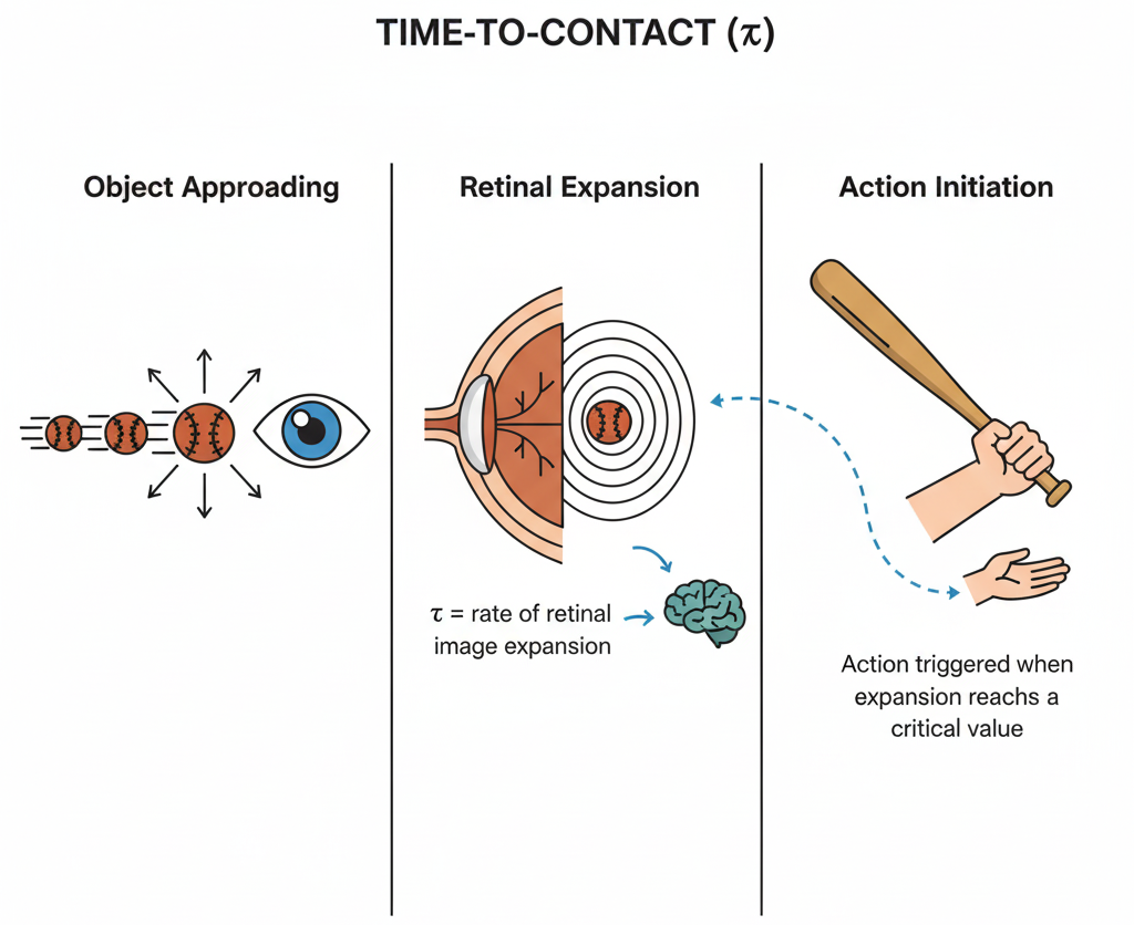 ⌛ Time-to-contact (τ): retinal image expansion rate specifies when to initiate action, often non-consciously