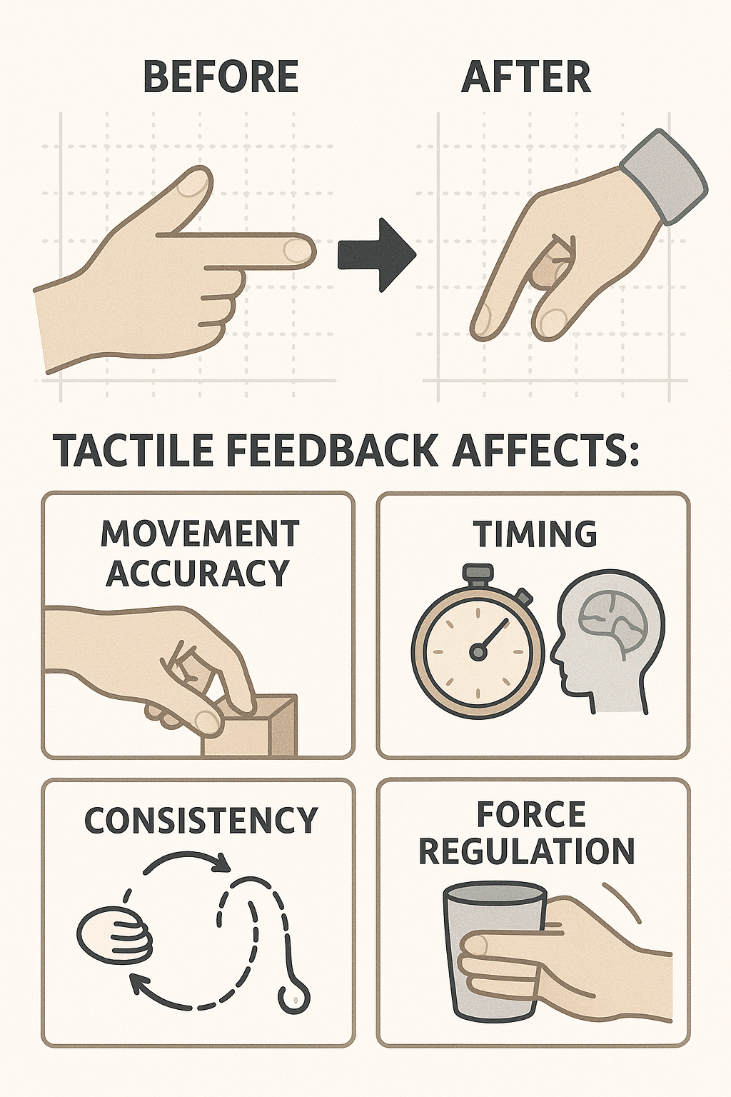 ✋ Tactile feedback supports accuracy, timing, consistency, and force regulation; anesthetizing fingertips degrades performance