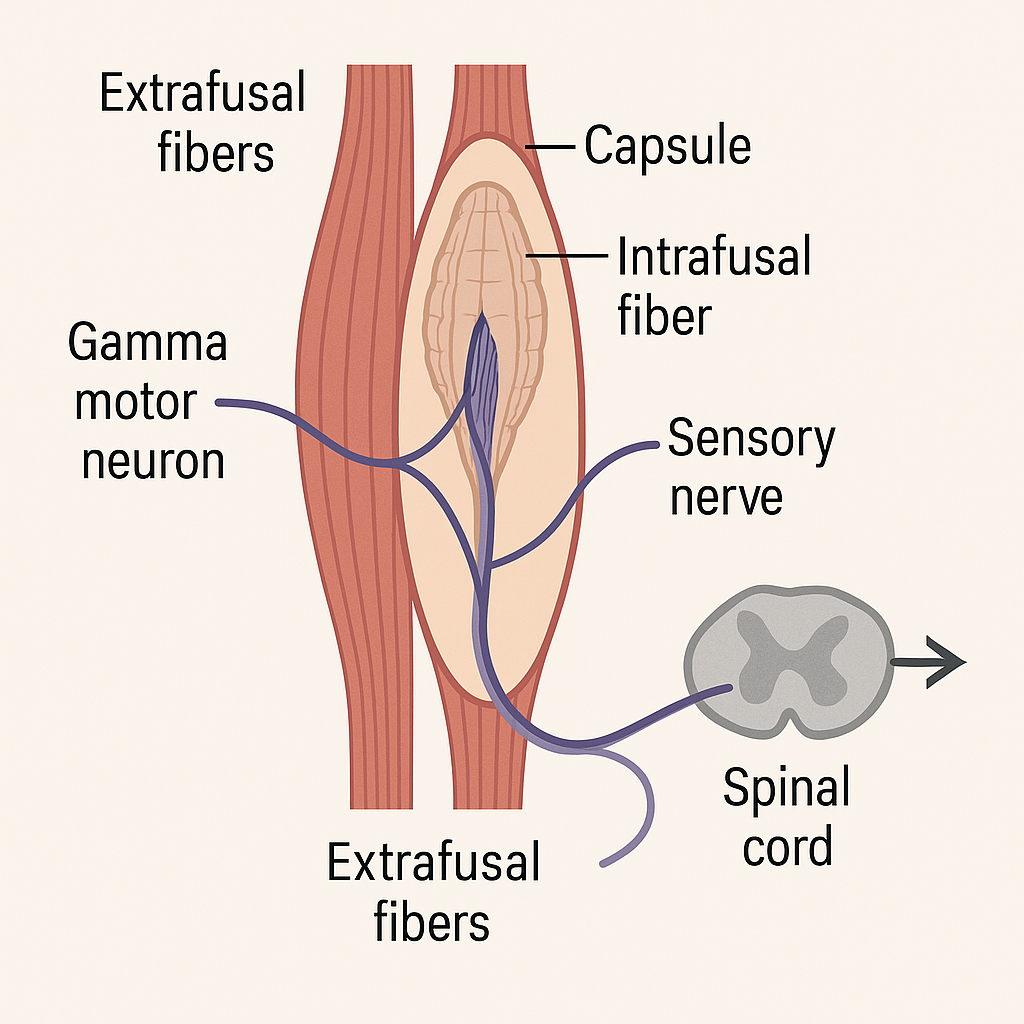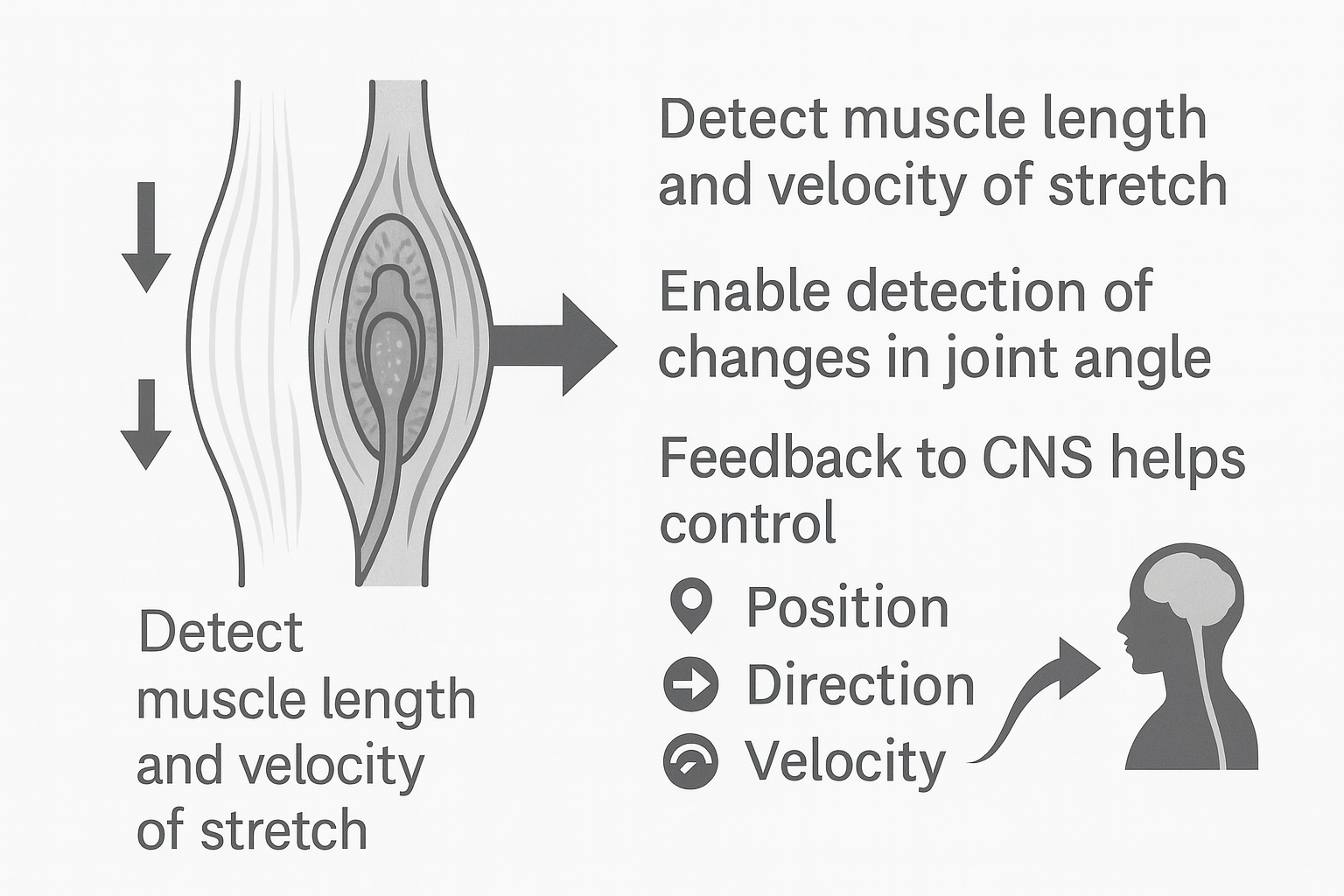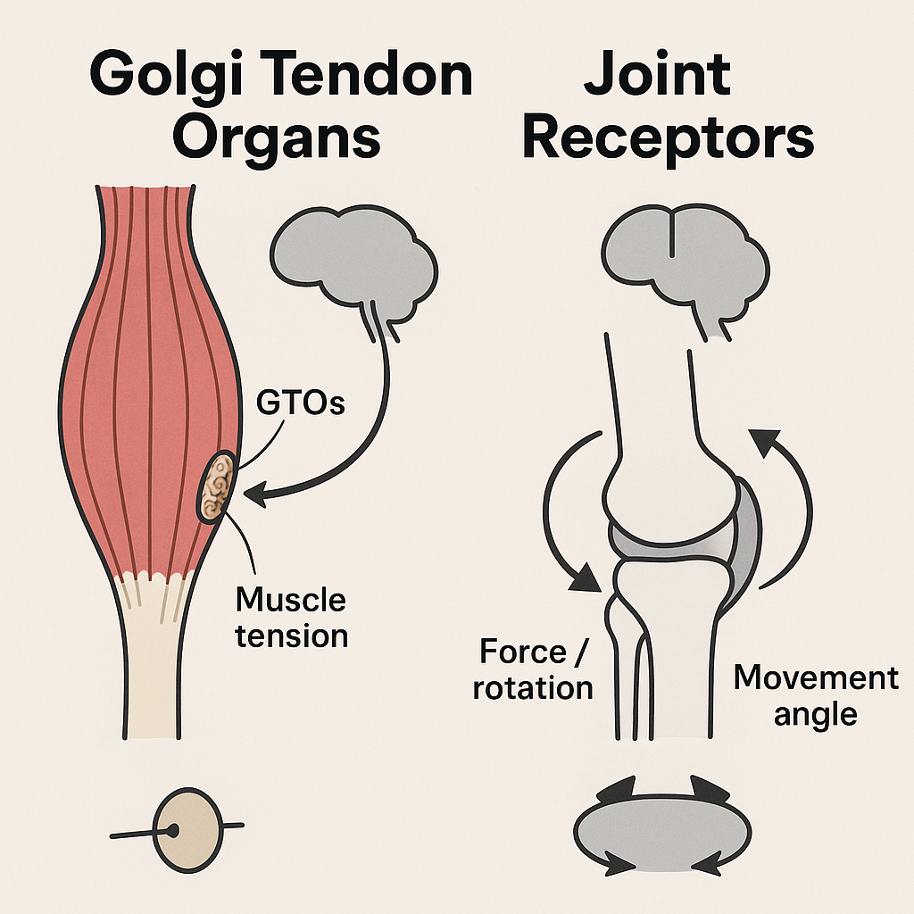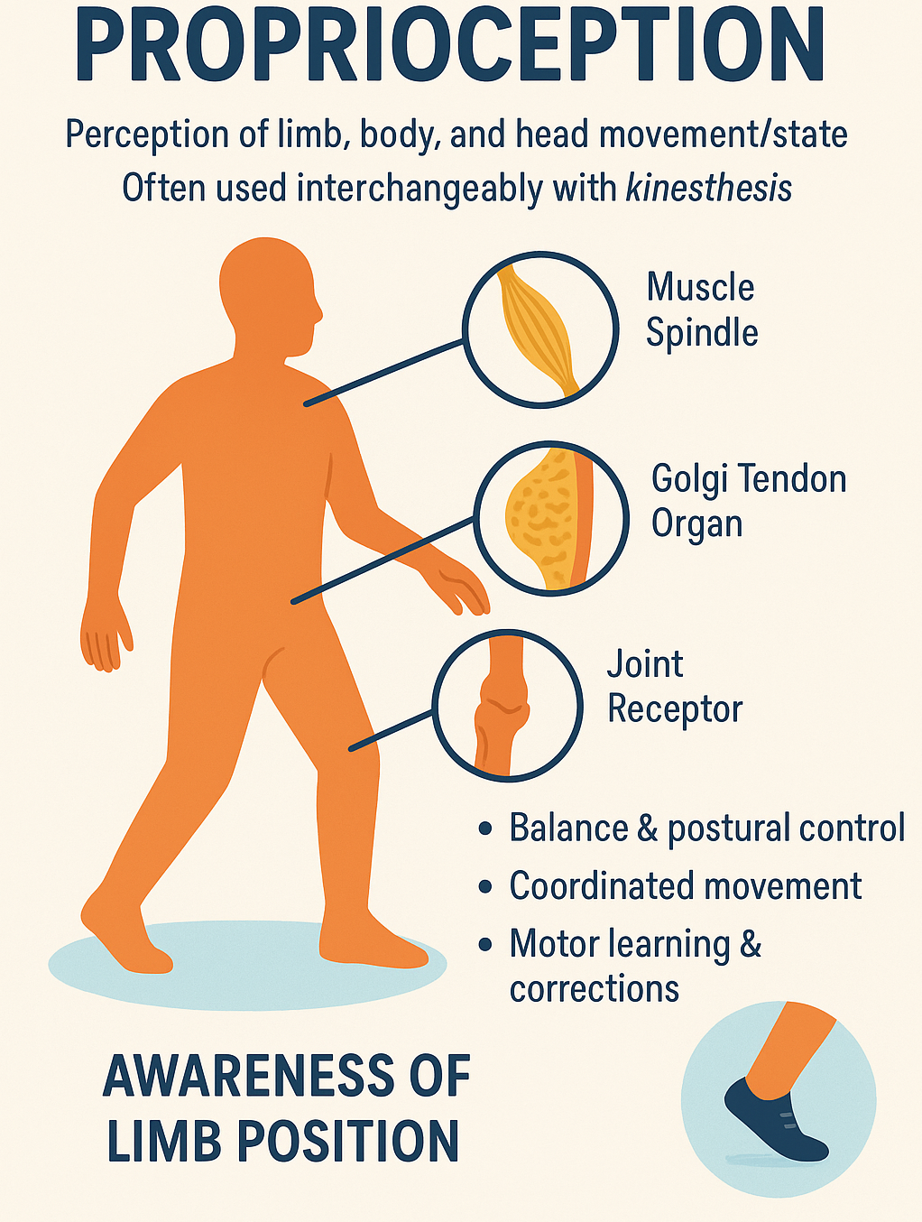 🧩 Proprioceptors (muscle spindles, GTOs, joint receptors) signal length/velocity, tension, and joint position → essential for posture, coordination, and movement correction