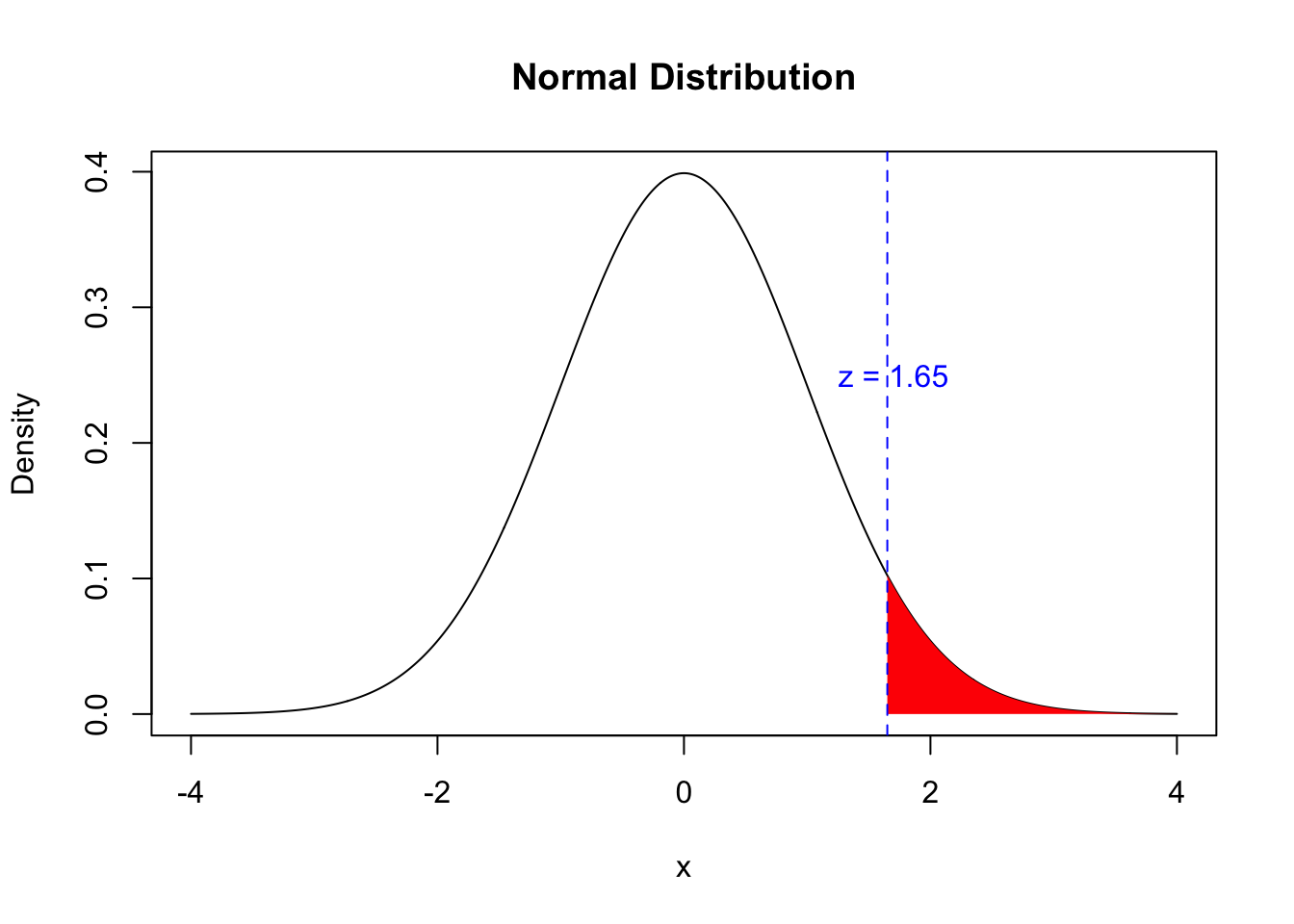 # set mean and standard deviationmu <-0sigma <-1# create x-axis valuesx <-seq(-4, 4, by =0.01)# create normal distributiony <-dnorm(x, mean = mu, sd = sigma)# plot normal distributionplot(x, y, type ="l", xlab ="x", ylab ="Density", main ="Normal Distribution")# shade rejection regionx_reject <-seq(1.65, 4, by =0.01)y_reject <-dnorm(x_reject, mean = mu, sd = sigma)polygon(c(x_reject, 4, 4, x_reject[1]), c(y_reject, 0, dnorm(4, mean = mu, sd = sigma), 0), col ="red", border =NA)# indicate z-score for rejection regionabline(v =1.65, col ="blue", lty =2)text(1.7, 0.25, "z = 1.65", col ="blue")