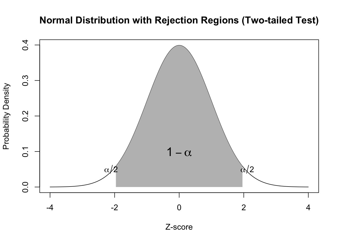 # Define mean and standard deviationmu <-0sigma <-1# Create x-axis valuesx <-seq(-4, 4, length.out =1000)# Calculate y-axis values using probability density functiony <-dnorm(x, mean = mu, sd = sigma)# Plot normal distributionplot(x, y, type ="l", xlab ="Z-score", ylab ="Probability Density",main ="Normal Distribution with Rejection Regions (Two-tailed Test)")# Define alpha levelalpha <-0.05# Define rejection regionslower_reject <-qnorm(alpha/2, mean = mu, sd = sigma)upper_reject <-qnorm(1-alpha/2, mean = mu, sd = sigma)# Shade rejection regionspolygon(c(lower_reject, seq(lower_reject, upper_reject, length.out =100), upper_reject),c(0, dnorm(seq(lower_reject, upper_reject, length.out =100), mean = mu, sd = sigma), 0),col ="gray", border =NA)# Add text labels for rejection regionstext(lower_reject -0.15, 0.05, expression(alpha/2))text(upper_reject +0.15, 0.05, expression(alpha/2))# Add text label for non-rejection regiontext((lower_reject + upper_reject)/2, 0.1, expression(1-alpha), cex =1.5)
