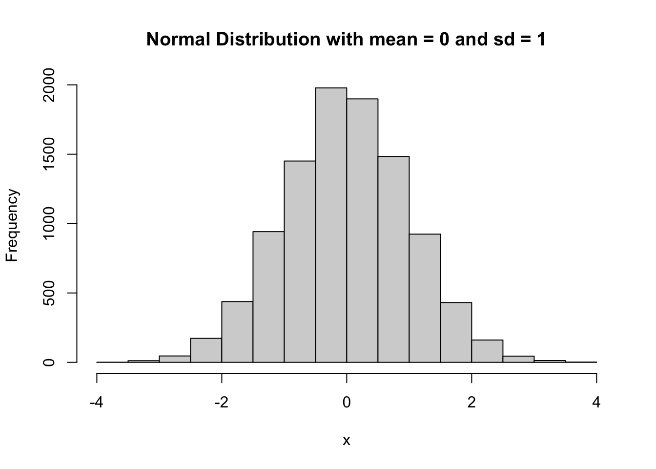 # Set the seed for reproducibilityset.seed(123)# Generate a random sample from a normal distribution with mean 0 and sd 1x <-rnorm(10000, mean =0, sd =1)# Create a histogram of the datahist(x, main ="Normal Distribution with mean = 0 and sd = 1")