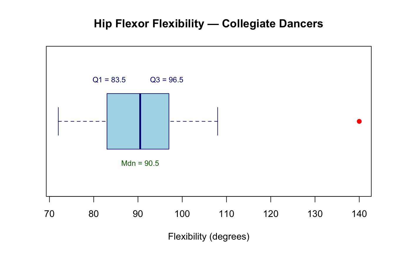 The median (\(Mdn\)) is the middle value when observations are ordered from smallest to largest. For an even number of observations it is the average of the two central values (Weir & Vincent, 2021). The median is resistant to outliers because it is determined by rank position, not magnitude.