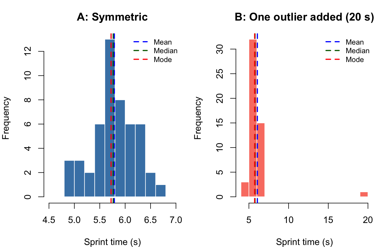 #| fig-cap: "Sprint times (seconds) for 50 simulated youth athletes. Left panel shows a symmetric distribution; right panel introduces a single outlier (20 s). Dashed vertical lines mark the mean (blue), median (green), and mode (red)."