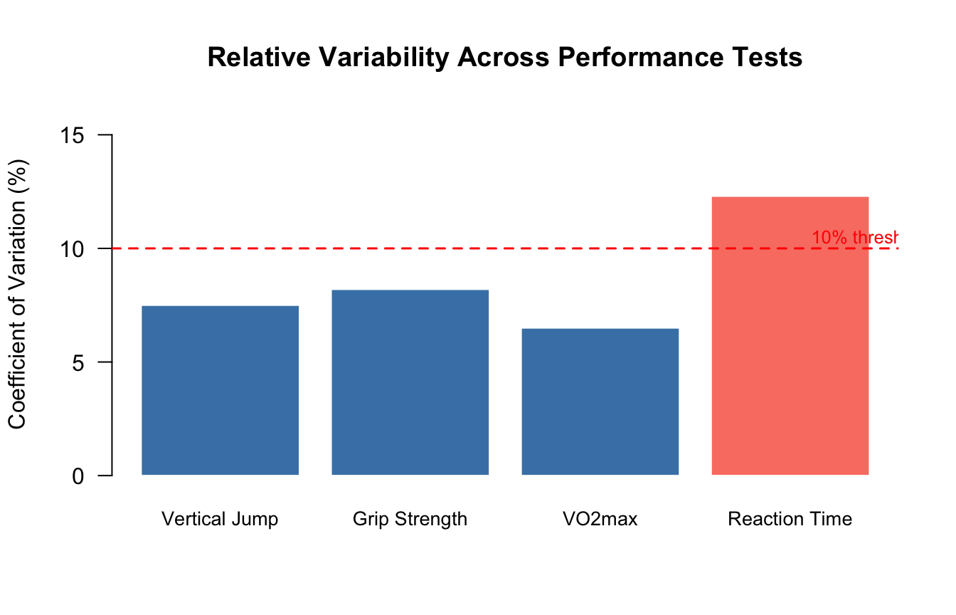 #| fig-cap: "Coefficient of variation (%) for four common kinesiology performance tests. The dashed line at 10% marks a frequently used threshold separating low from moderate variability."