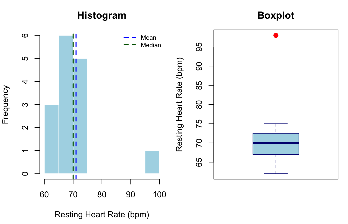 Key takeaway: The mean (72.3 bpm) is pulled upward by the outlier; the median (70 bpm) is unaffected. The boxplot flags the outlier immediately. A researcher who reports only the mean without a boxplot or histogram would not detect this anomaly (Field, 2018).