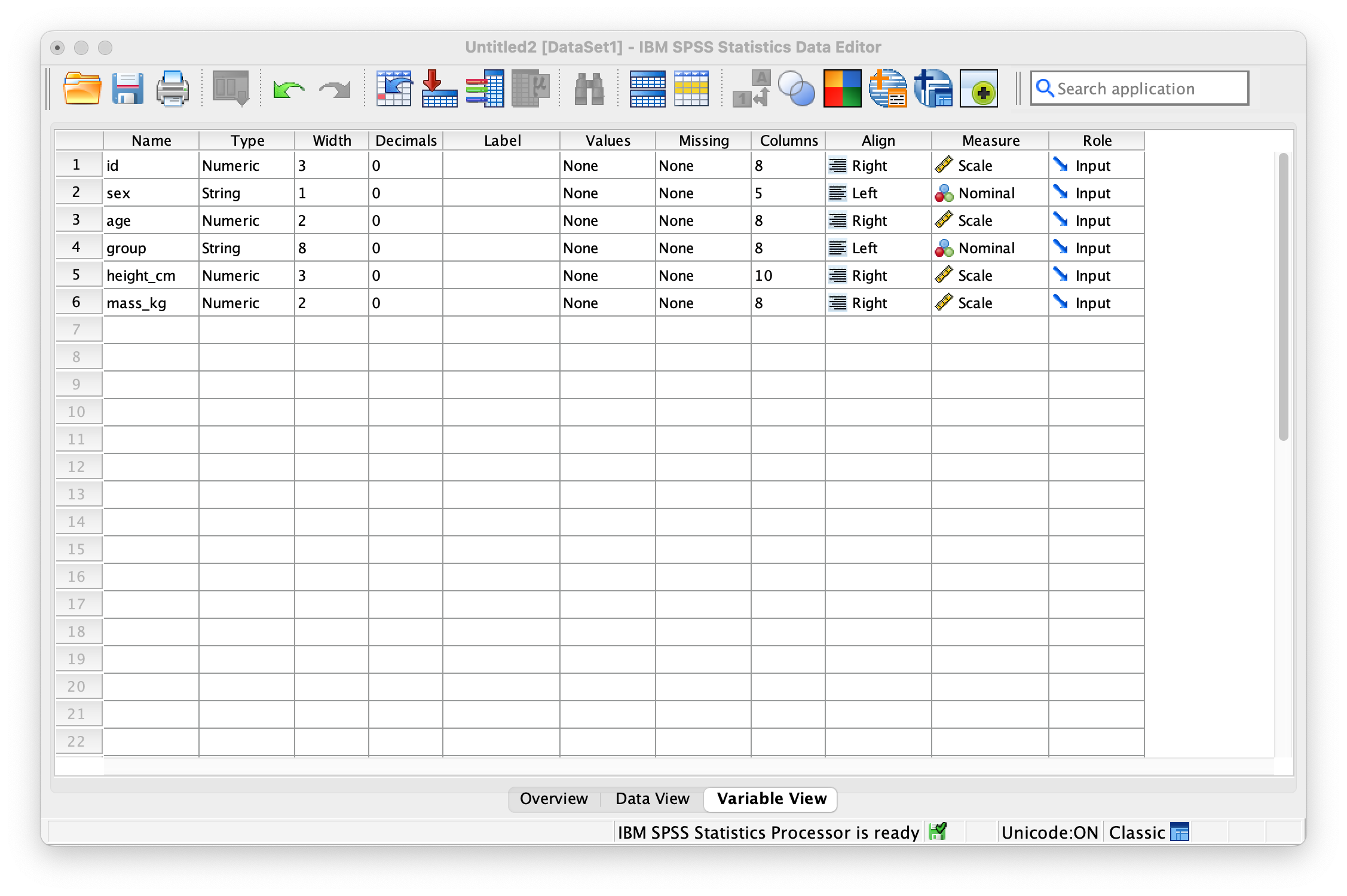 height_cm, “Pre-test score” forpre_score, “Post-test score” forpost_score). For categorical variables likesexandgroup, define value labels (M = ‘Male’, F = ‘Female’ for sex; control = ‘Control’, training = ‘Training’ for group). Set the appropriate measurement level for each variable: Scale for continuous variables, Ordinal for ordered categories, and Nominal for unordered categories.Data Transformation: Create two new computed variables. First, create