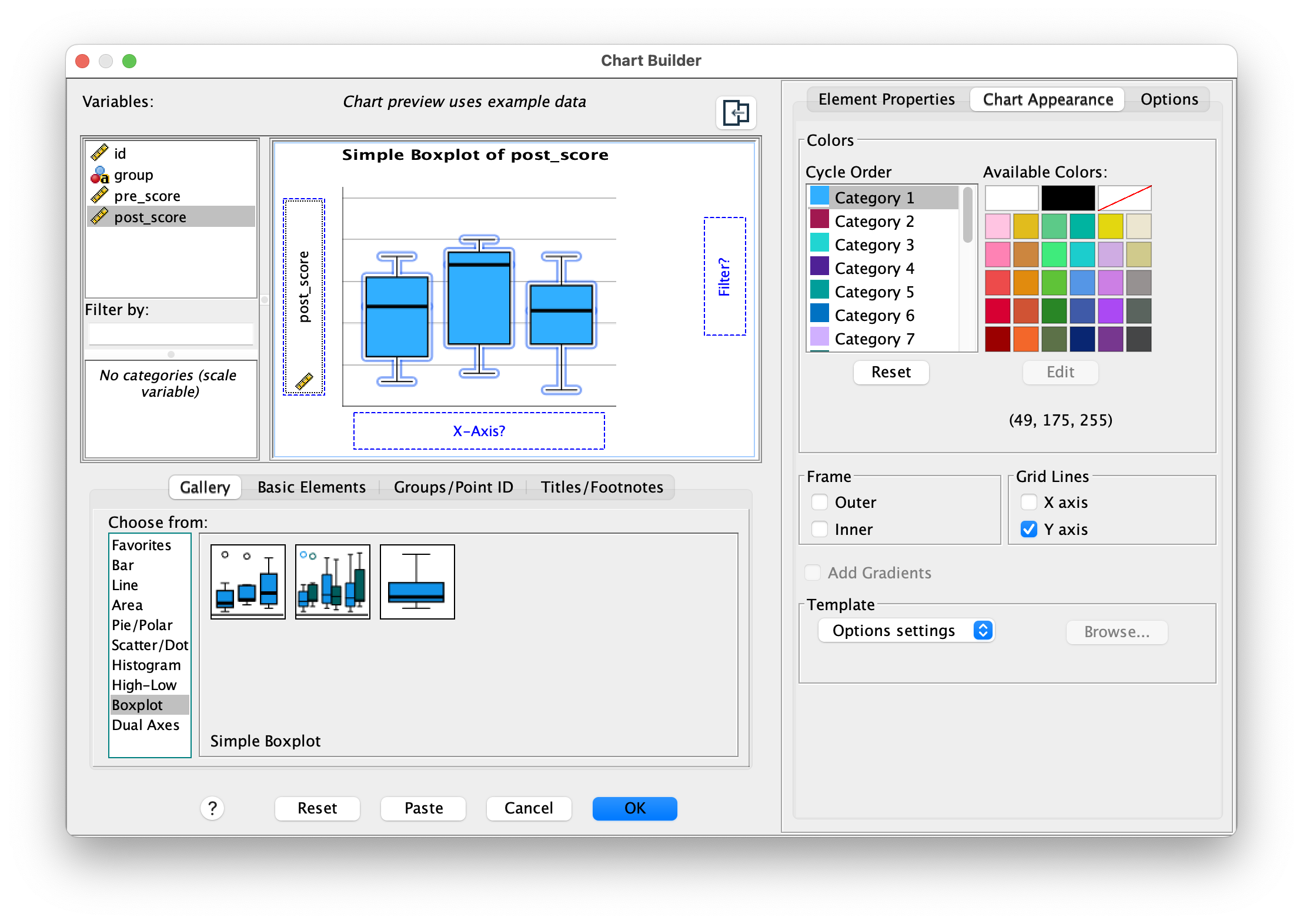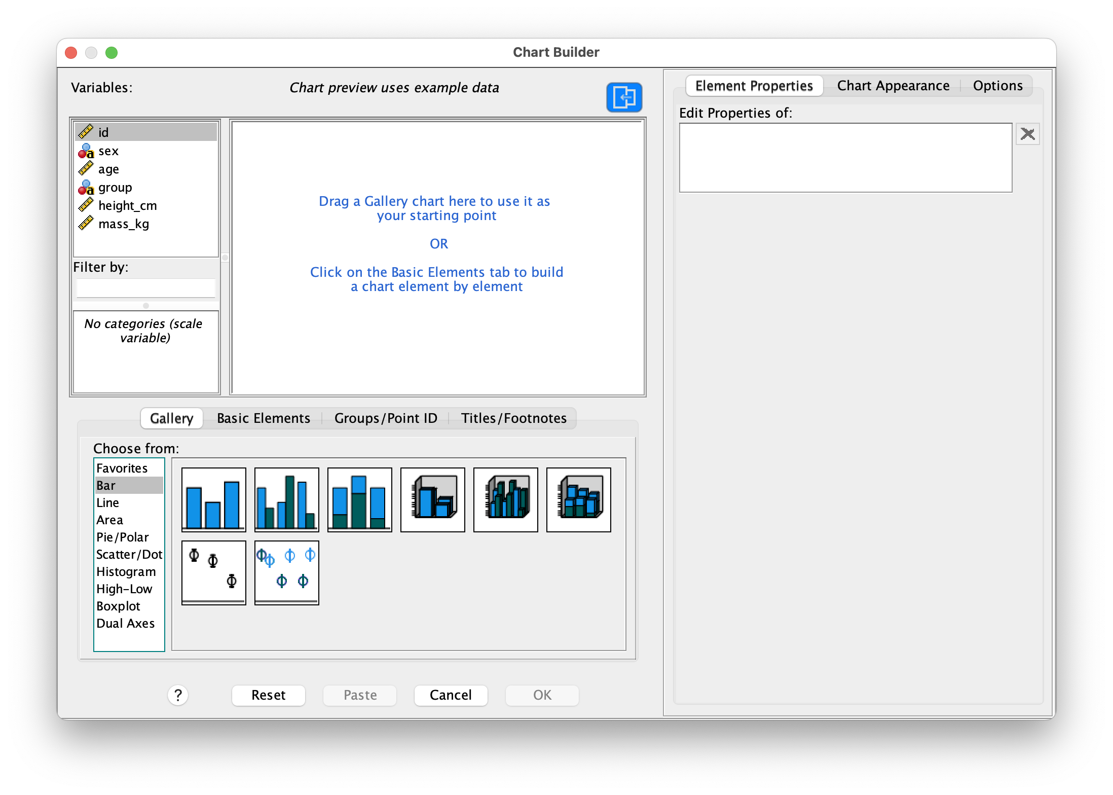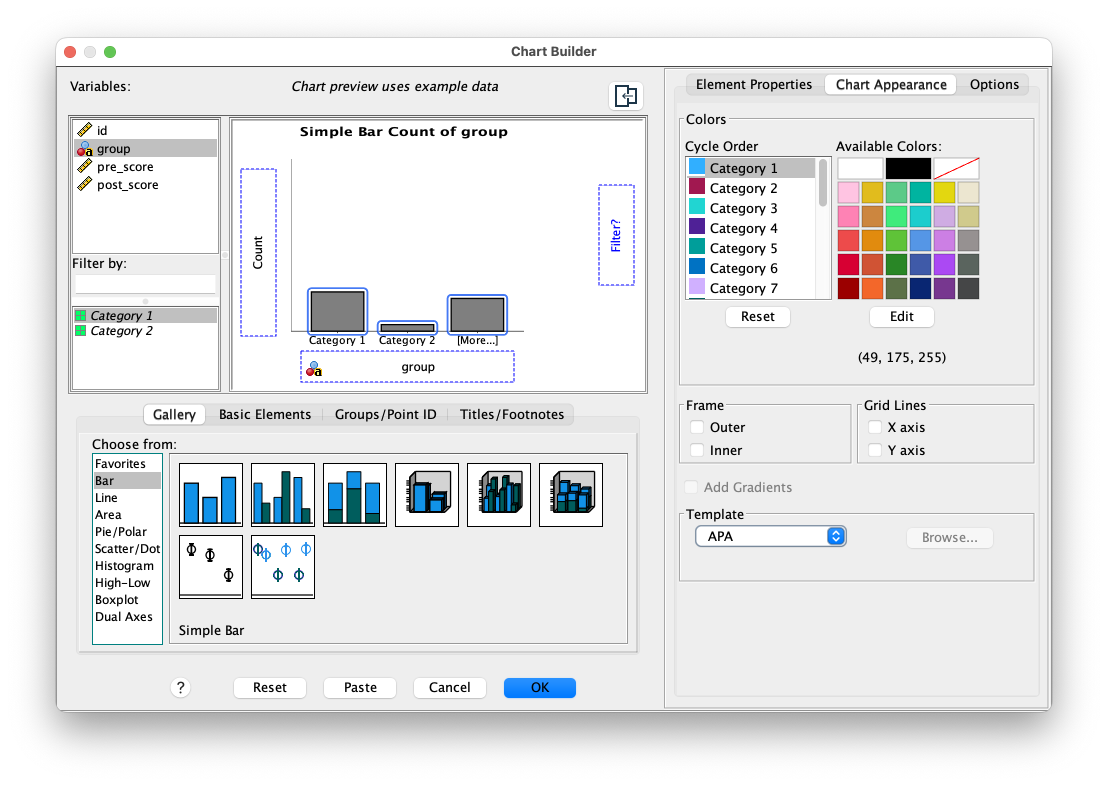 To create any chart, start by selecting Graphs > Chart Builder from the menu. You’ll see a gallery of chart types on the left; drag your chosen chart type onto the canvas in the center. Assign your variables to the appropriate axes by dragging them from the Variables list. Once the basic structure is in place, customize the appearance by adding titles, axis labels, changing colors, and adjusting fonts to match your preferences. Finally, click OK to generate the chart in the Output Viewer, where you can further refine it if needed.