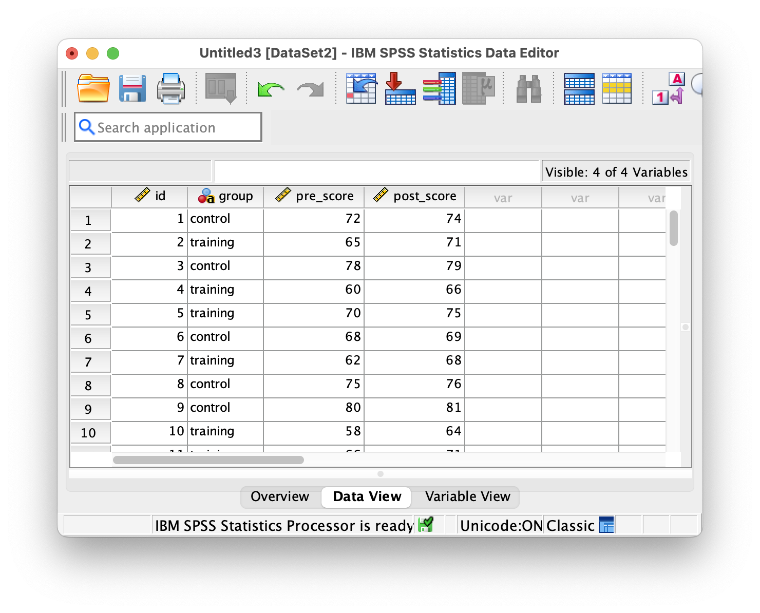 - Variables: id, group, pre_score, post_score