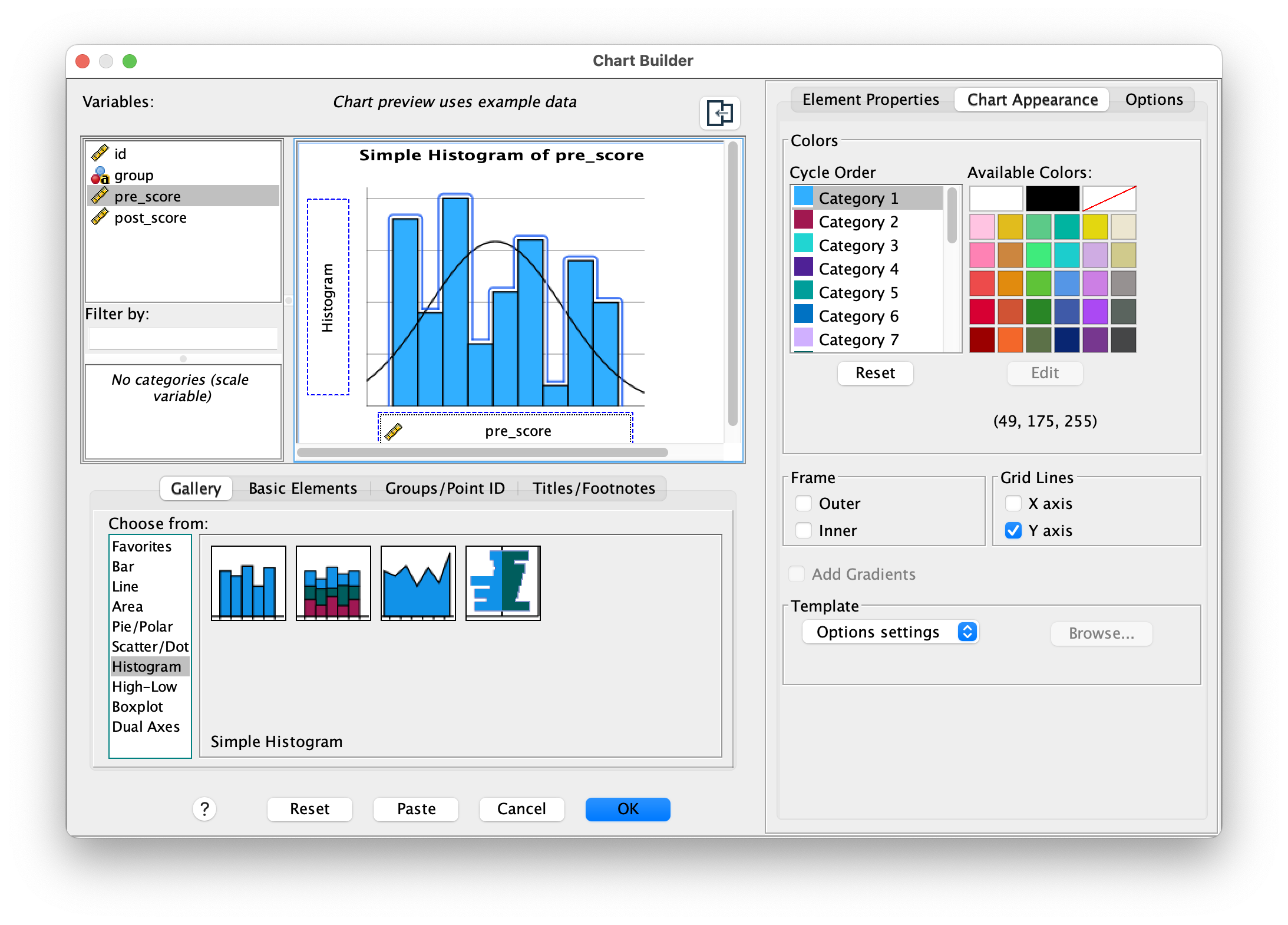 The Chart Builder uses an intuitive drag-and-drop interface that makes creating visualizations straightforward. You can preview how your chart will look and customize various elements like colors, labels, and formatting before generating the final version. While SPSS also maintains Legacy Dialogs for creating charts (found under Graphs > Legacy Dialogs), the Chart Builder offers a more visual and user-friendly approach with better preview capabilities. The legacy dialogs are still available for users who prefer the older interface or need specific chart types not yet available in Chart Builder, but for most purposes, Chart Builder provides greater flexibility and easier customization.
