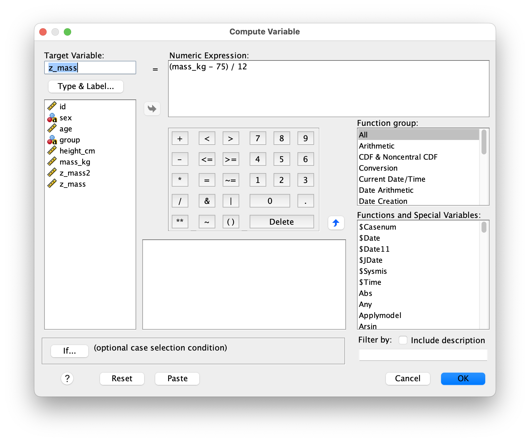 COMPUTE z_mass = (mass_kg - 75) / 12.