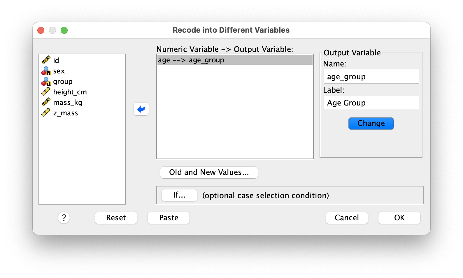 mass_kgvariable to examine its distribution—look for whether it appears normally distributed or skewed. Second, create a boxplot comparingmass_kgacross thegroupvariable to see if there are differences between control and training groups. Export both charts as image files to yourfiguresfolder using File > Export after right-clicking each chart.Syntax Documentation: This is crucial for reproducibility. Open a new Syntax Editor (File > New > Syntax). Go back through each of the steps above (import, compute, recode, chart) and use the Paste button instead of OK to capture the syntax for each operation. Organize your syntax file with clear comments explaining each section. Add