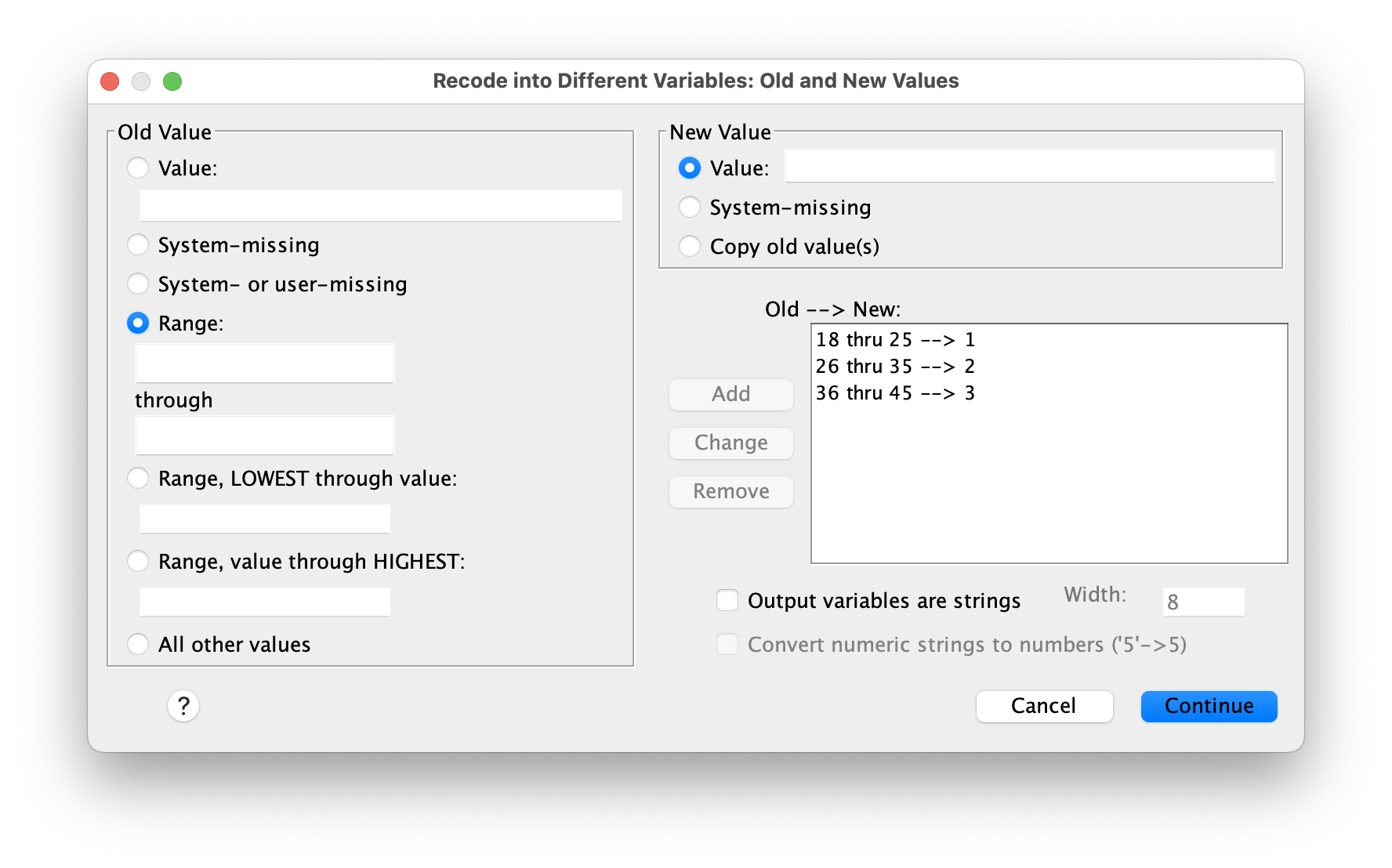 RECODE age (18 thru 25=1) (26 thru 35=2) (36 thru 45=3) INTO age_group.
