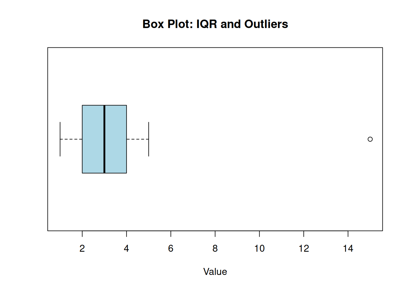 # Create a dataset with concentrated values and an extreme pointdata <-c(1, 2, 2, 2, 3, 3, 3, 3, 3, 4, 4, 5, 15)# Create a box plotboxplot(data, horizontal =TRUE, col ="lightblue", main ="Box Plot: IQR and Outliers", xlab ="Value")