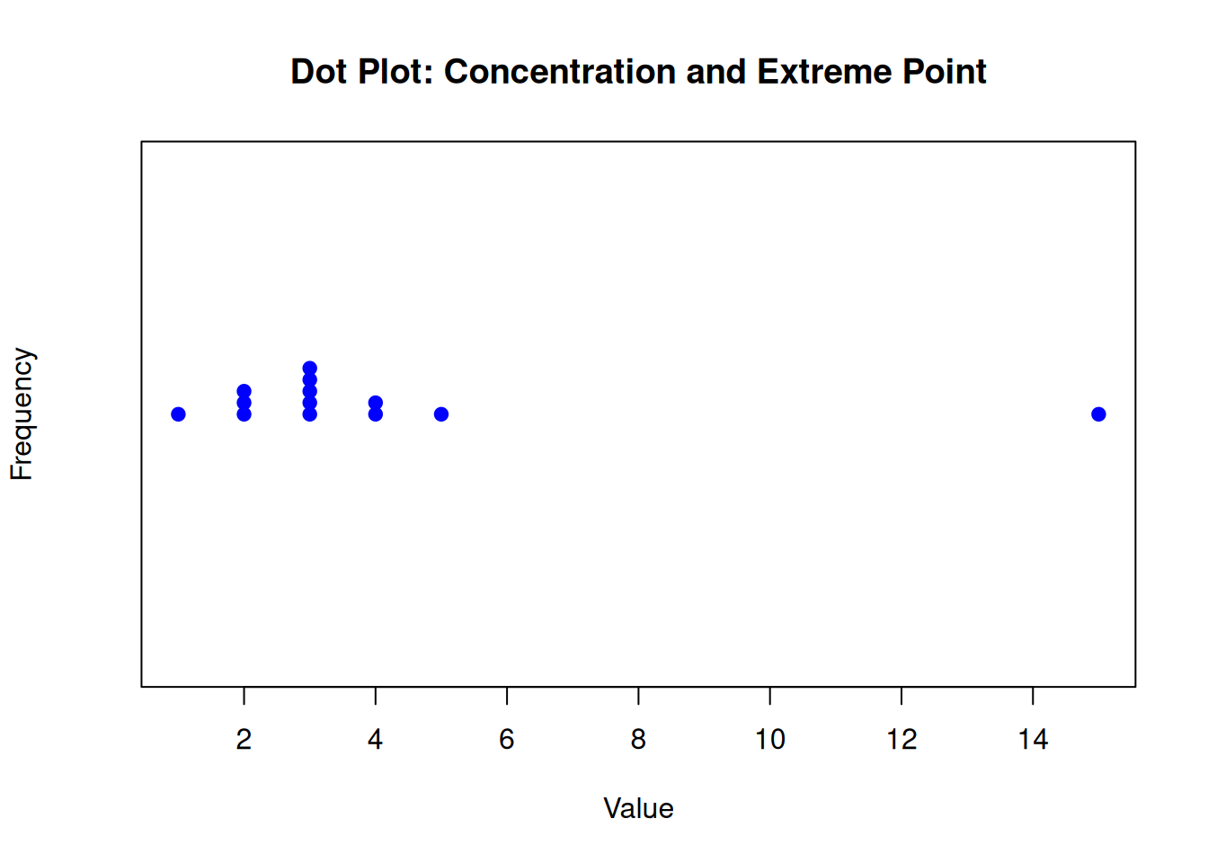 # Create a dataset with concentrated values and an extreme pointdata <-c(1, 2, 2, 2, 3, 3, 3, 3, 3, 4, 4, 5, 15)# Create a dot plotstripchart(data, method ="stack", pch =19, col ="blue", main ="Dot Plot: Concentration and Extreme Point", xlab ="Value", ylab ="Frequency")