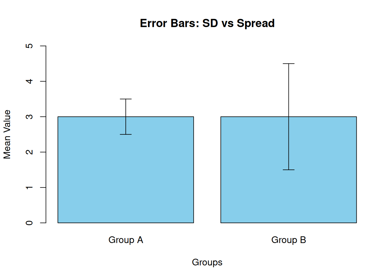 # Sample data: two groups with same mean but different SDmeans <-c(3.0, 3.0)sds <-c(0.5, 1.5)groups <-c("Group A", "Group B")# Create bar plotbar_positions <-barplot(means, names.arg = groups, col ="skyblue", ylim =c(0, 5), main ="Error Bars: SD vs Spread", ylab ="Mean Value", xlab ="Groups")# Add error bars (SD)arrows(bar_positions, means - sds, bar_positions, means + sds, angle =90, code =3, length =0.1, col ="black")