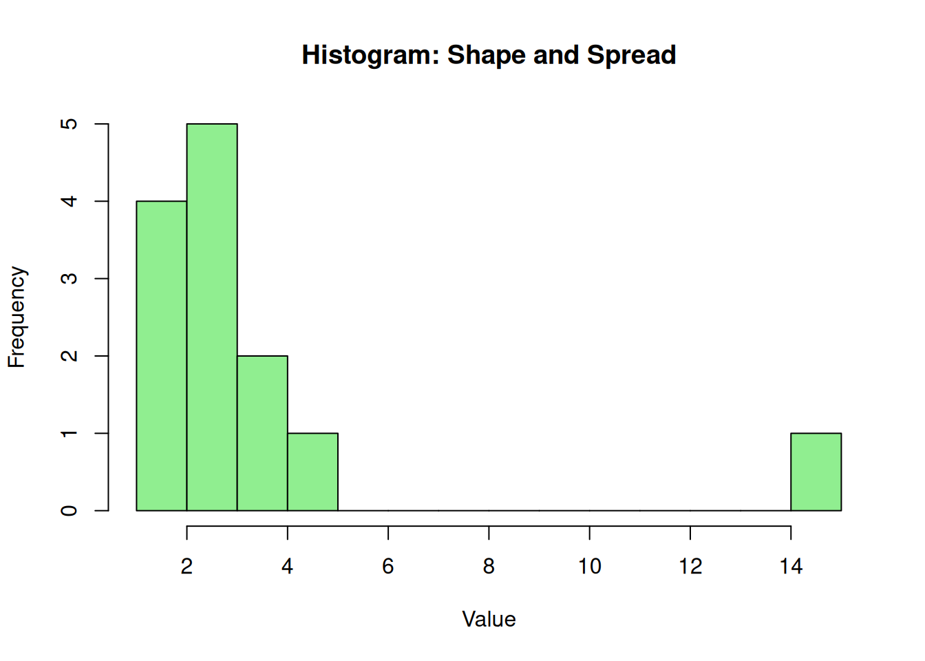 # Create a dataset with concentrated values and an extreme pointdata <-c(1, 2, 2, 2, 3, 3, 3, 3, 3, 4, 4, 5, 15)# Create a histogramhist(data, breaks =10, col ="lightgreen", main ="Histogram: Shape and Spread", xlab ="Value", ylab ="Frequency")