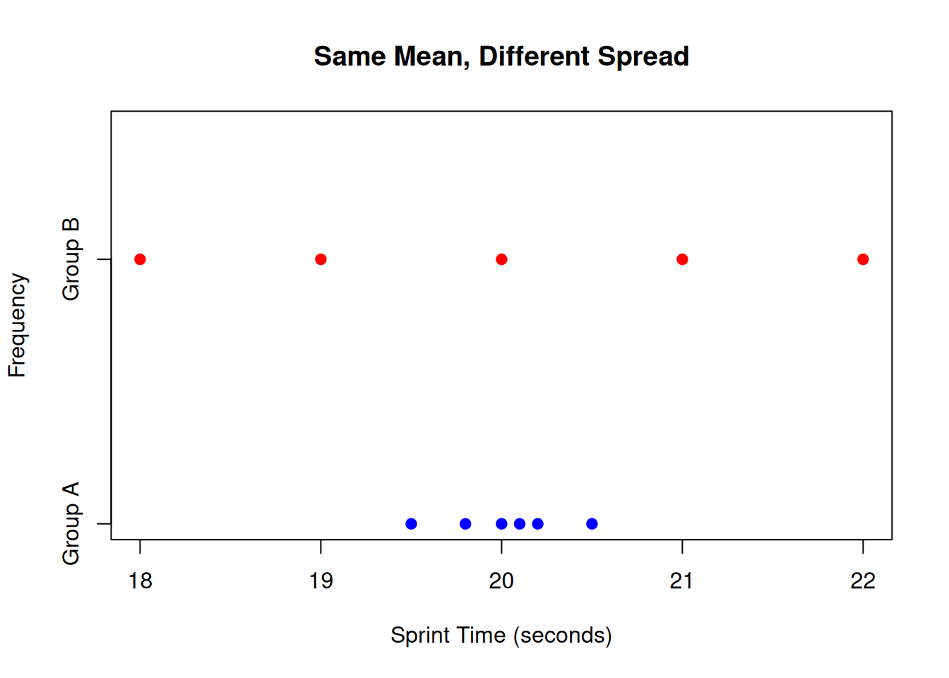 # Group A: tightly clustered around 20groupA <-c(19.5, 19.8, 20.0, 20.1, 20.2, 20.5)# Group B: scattered around 20groupB <-c(18.0, 19.0, 20.0, 21.0, 22.0)# Combine dataall_data <-c(groupA, groupB)groups <-factor(c(rep("Group A", length(groupA)), rep("Group B", length(groupB))))# Create side-by-side dot plotsstripchart(all_data ~ groups, method ="stack", pch =19, col =c("blue", "red"), main ="Same Mean, Different Spread", xlab ="Sprint Time (seconds)", ylab ="Frequency")