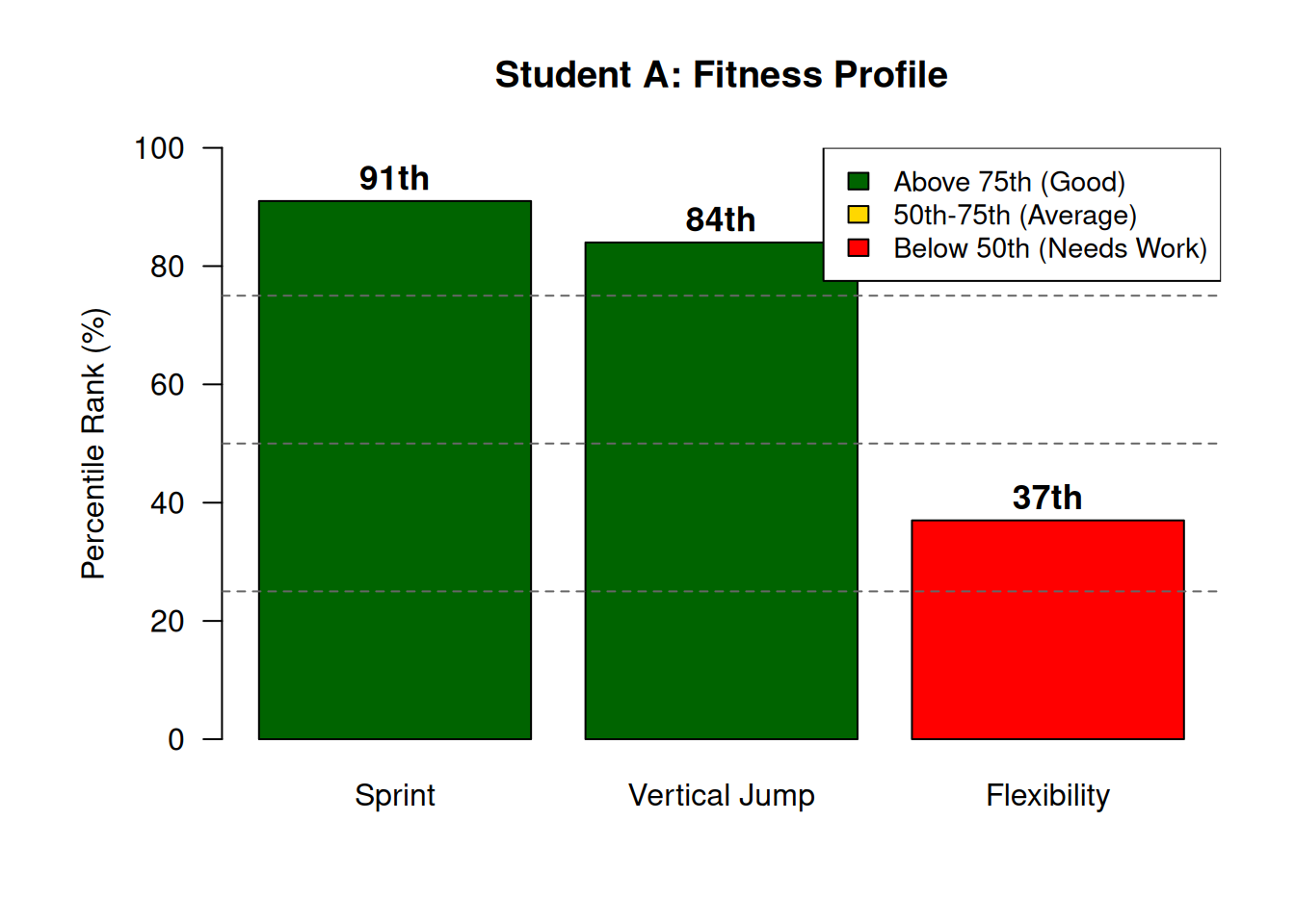 This fitness profile visualizes Student A’s relative standing across three fitness components using percentile ranks, which are more intuitive for applied audiences than z-scores. Green bars indicate strong performance (above 75th percentile), gold indicates average performance (50th–75th), and red indicates areas needing improvement (below 50th). The dashed horizontal lines at the 25th, 50th, and 75th percentiles provide reference points for interpretation. Student A shows clear strengths in sprint speed (91st percentile) and vertical jump (84th percentile), both power-related attributes, but demonstrates a relative weakness in flexibility (37th percentile). This type of profile is widely used in fitness centers, sports medicine clinics, and talent identification programs to communicate results to athletes, clients, and coaches in an accessible format.