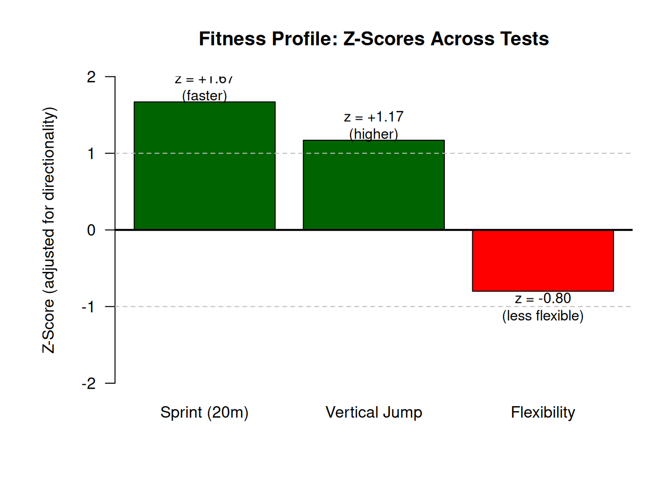 Comparing 3.25 seconds to 35 centimeters is meaningless because the measurements use completely different units and scales—there is no basis for saying one is “better” or “worse” than the other. Z-scores solve this by transforming both values into a common scale: standard deviations from the mean. If the sprint time has a z-score of −1.8 (1.8 SD faster than average) and the sit-and-reach has a z-score of +0.5 (0.5 SD more flexible than average), we can now see that the athlete shows greater relative strength in sprint speed than in flexibility. The z-scores remove the dependency on units and allow direct comparison of relative standing within each domain.