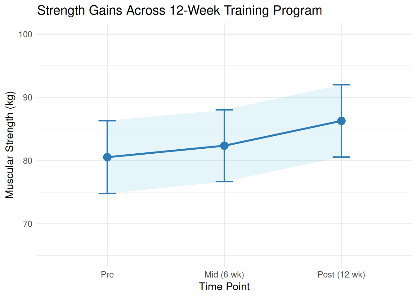 library(ggplot2)library(dplyr)set.seed(42)# Simulate data matching core_session.csv training group valuesn <-30pre <-rnorm(n, mean =79.7, sd =12.3)mid <- pre +rnorm(n, mean =2.0, sd =1.5)post <- pre +rnorm(n, mean =5.4, sd =1.8)df_long <-data.frame(id =rep(1:n, 3),time =factor(rep(c("Pre", "Mid (6-wk)", "Post (12-wk)"),each = n),levels =c("Pre", "Mid (6-wk)", "Post (12-wk)")),strength =c(pre, mid, post))summary_df <- df_long %>%group_by(time) %>%summarise(M =mean(strength),SD =sd(strength),n =n(),SE = SD /sqrt(n),CI_lo = M -qt(0.975, df = n -1) * SE,CI_hi = M +qt(0.975, df = n -1) * SE )ggplot(summary_df, aes(x = time, y = M, group =1)) +geom_ribbon(aes(ymin = CI_lo, ymax = CI_hi), alpha =0.15, fill ="#5bc0de") +geom_line(linewidth =1.1, colour ="#2c7bb6") +geom_point(size =4, colour ="#2c7bb6") +geom_errorbar(aes(ymin = CI_lo, ymax = CI_hi),width =0.15, linewidth =0.8, colour ="#2c7bb6") +labs(x ="Time Point", y ="Muscular Strength (kg)",title ="Strength Gains Across 12-Week Training Program") +coord_cartesian(ylim =c(65, 100)) +theme_minimal(base_size =13)