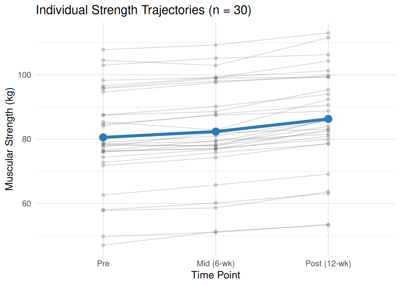 Figure 15.2: Individual participant strength trajectories (spaghetti plot) across three time points. Each thin grey line represents one participant, with the bold blue line showing the group mean. The consistent upward trajectory across virtually all participants illustrates why the within-subjects effect is so large: the training effect is reliable and similar across individuals.