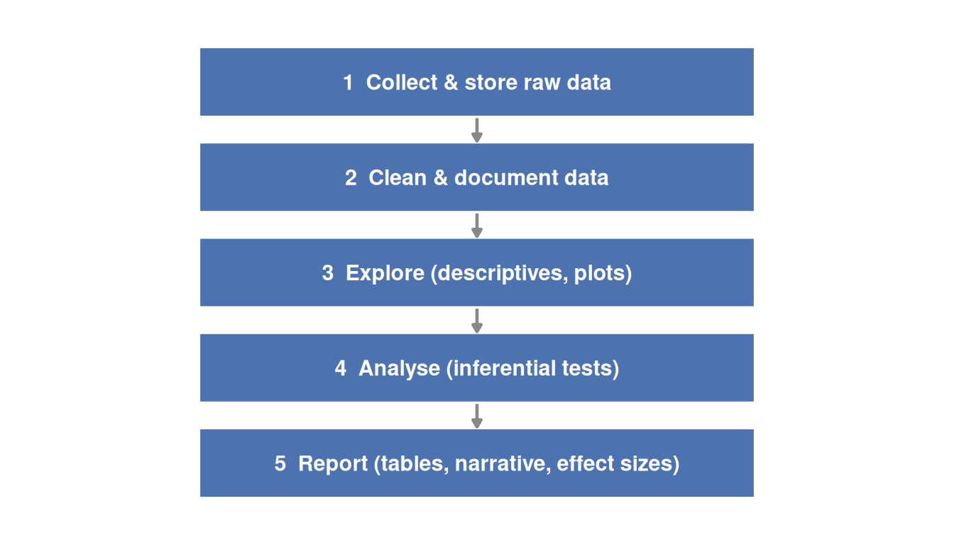 The workflow is the same whether you are using SPSS or R: import data, clean it, explore it, analyse it, and report it. The difference is in how each step is documented. In SPSS, documentation comes from saving syntax files and annotating the output. In R, documentation lives in the script itself.