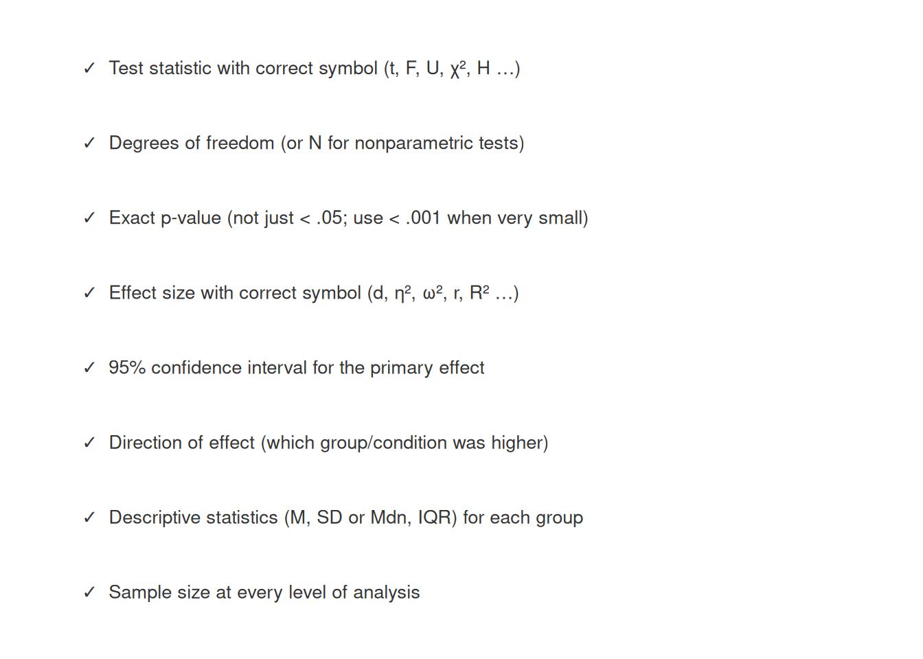 Before submitting a manuscript or thesis chapter, verify that every inferential result includes all of the following: